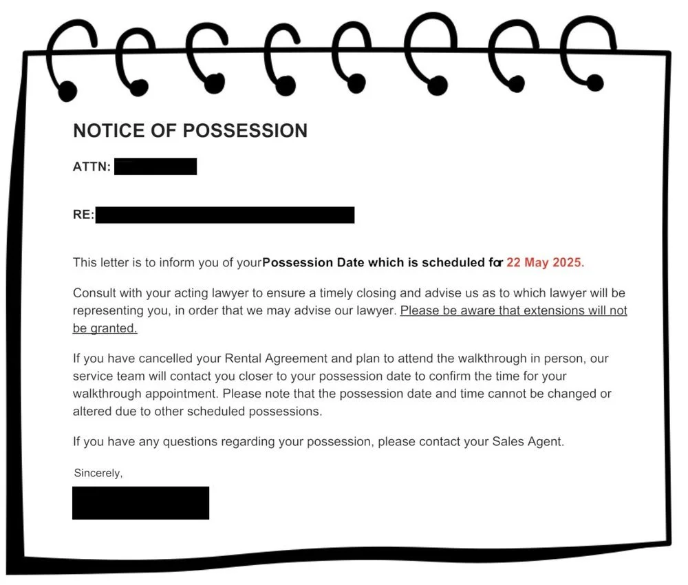 In Alberta developers legally only have to provide you with 30 days notice before possession so make sure you are staying up-to-date with the construction status.