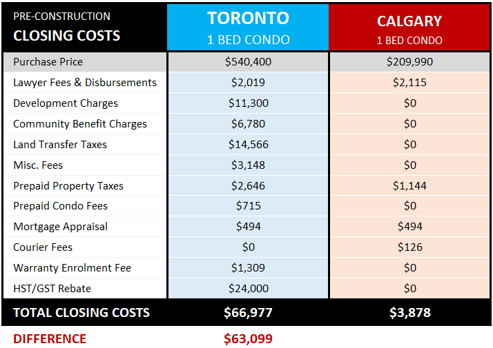 Costs vary significantly by city and province and even by project. Below are my actual closing costs I paid to close a 1 bed, 1 bath condo in Toronto VS Calgary: